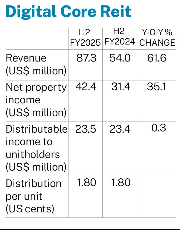 The flat DPU came even as H2 revenue rose 61.6 per cent to US$87.3 million. That increase followed its acquisition of an additional 15.1 per cent stake in a data centre in Frankfurt, Germany, in December 2024.