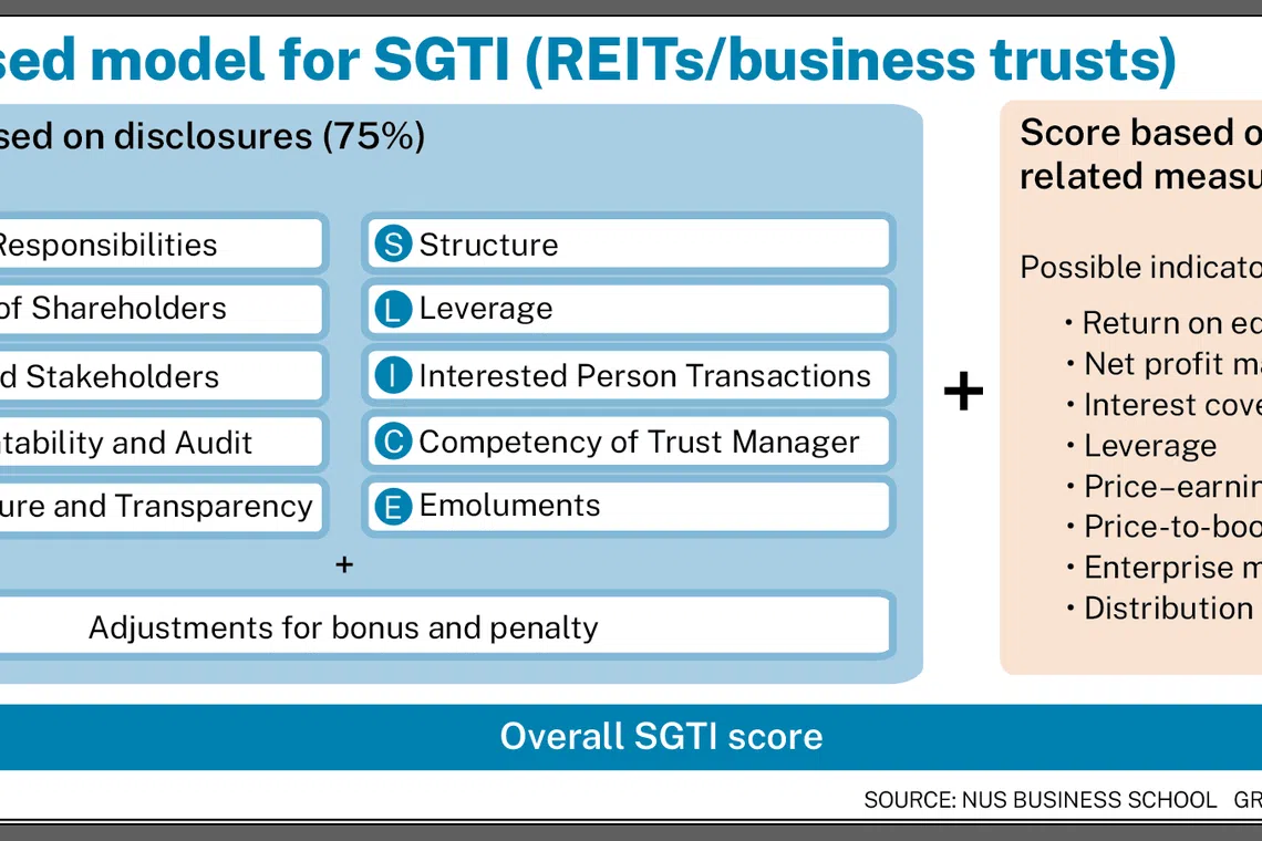 The base score for Reits and business trusts includes items in the base score for the SGTI (converted to 75 points), as well as trust-specific items for Reits and business trusts (25 points).