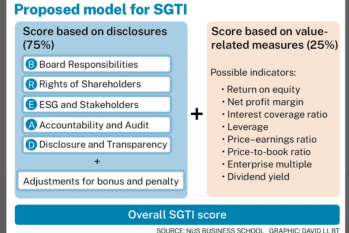 Indicators based on specific aspects such as dividend yield could also be included. These value measures would account for 25 per cent of the total SGTI score, with disclosure-based assessment making up the remaining 75 per cent.