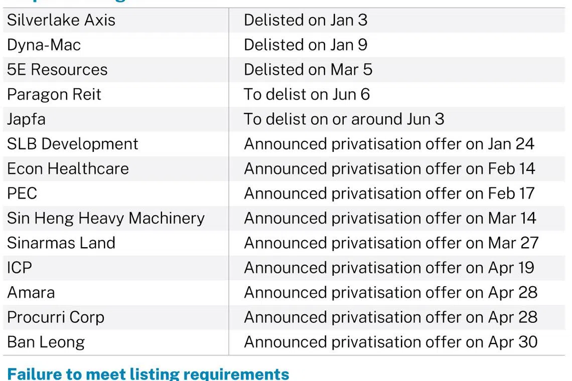 Three companies have already secured approval from their shareholders and announced their delisting dates. SMI Vantage is set to delist on May 15 while Japfa and Paragon Real Estate Investment Trust (Reit) are expected to delist in June after accepting privatisation offers.